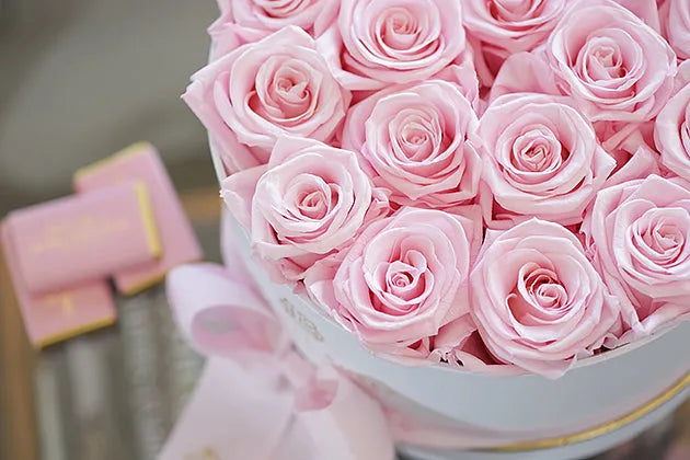- Lasting roses are displayed in a black or white box with our signature ribbon.